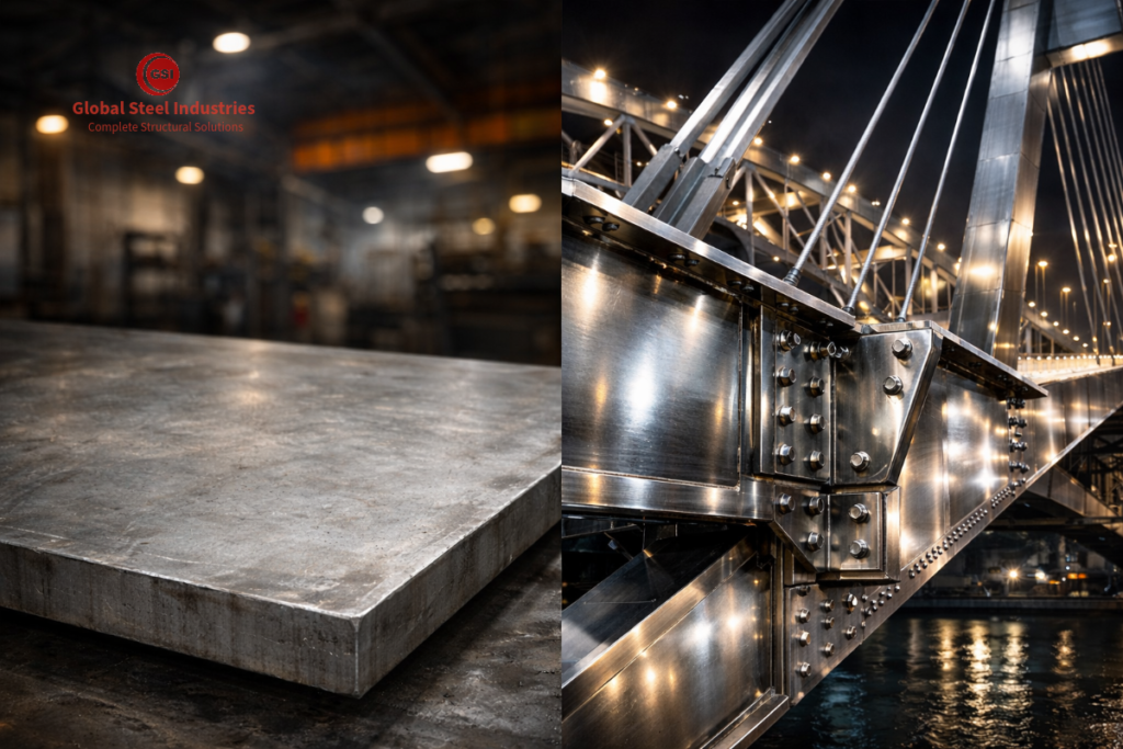 Both mild steel and high tensile steel are indispensable in modern industry. The right choice depends on your project’s load requirements, budget, fabrication processes, and design constraints. Global Steel Industries supplies both mild steel and high tensile steel in plates, sheets, coils, and structural sections — with certified grades and full material traceability. Contact our technical team for grade recommendations tailored to your project needs.